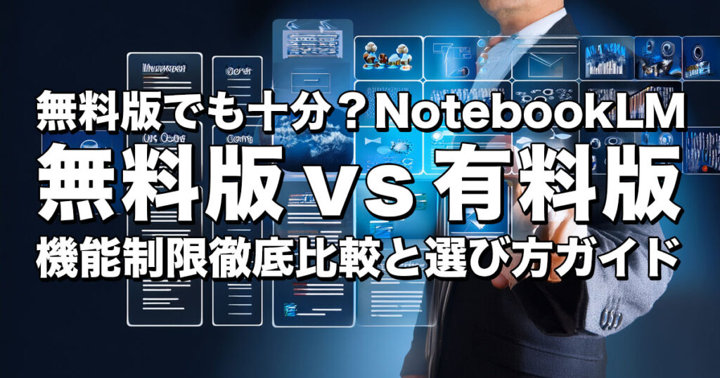 NotebookLMの無料版と有料版(NotebookLM Plus)の違いを徹底比較!無料版でどこまで使えるのか、有料版なら追加で何ができるのかを事例や比較表で解説。あなたの利用シーンに最適なプラン選びをサポートします。