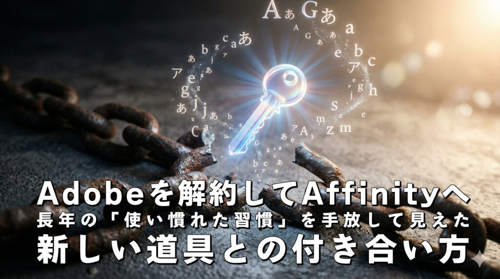 Adobeのサブスク代が高い、でも乗り換えは不安。そんな悩みに対し、長年のAdobeユーザーがAffinity V3 + Canvaへ移行して分かった「現実的な解決策」を共有します。フォント消失の壁をどう越え、操作の不安をどう解消したか。自分に「ちょうどいい道具」へと最適化し、クリエイティブの主導権を取り戻す手順を解説。