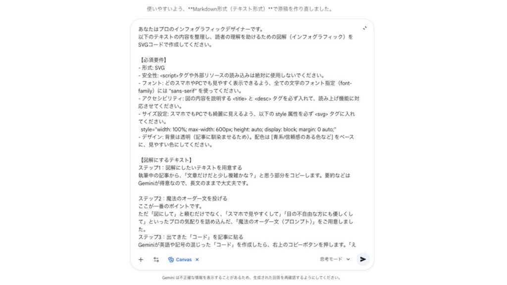 ただ「図にして」と頼むだけでなく、「スマホで見やすくして」「目の不自由な方にも優しくして」といったプロの気配りを詰め込んだ、「魔法のオーダー文(プロンプト)」をご用意しました。