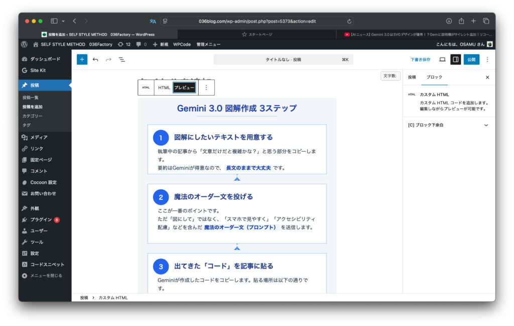 +ボタンを押してブロックを追加。- 検索窓に「HTML」と入力し、「カスタムHTML」を選びます。