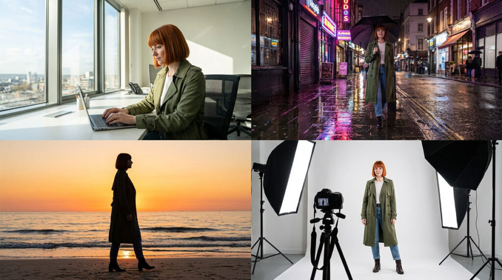 - スタジオ品質のライティング制御: プロンプトで「昼からマジックアワーに変更」「被写体の後ろからリムライトを当てる」といった指示を与え、物理ベースレンダリング(PBR)に匹敵するリアリズムで照明と色温度を制御できます。