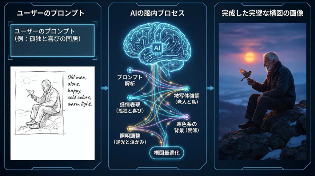 | 文脈と意図の抽出 | 「喜びと孤独感が同居する」といった抽象的で情緒的な要求を、セマンティックな概念として捉え、矛盾なく共存させる構図を追求します。 |